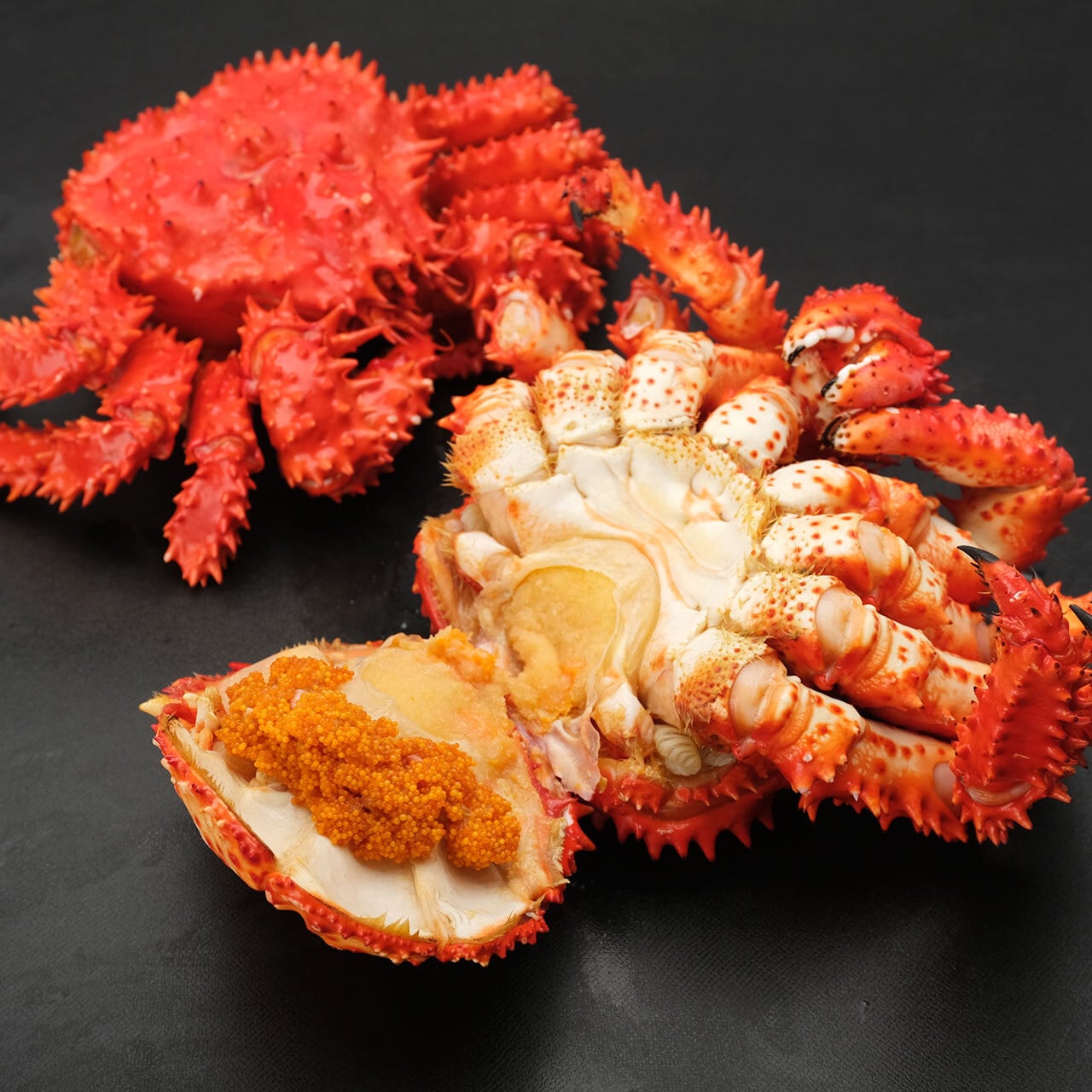 プチプチの外子とウニのような濃厚な味わいの内子が入っており、この珍味がまた格別なんです。花咲ガニの身と味噌、そしてこの外子と内子の珍味が一度に楽しめるのが子持ち花咲ガニの魅力。
