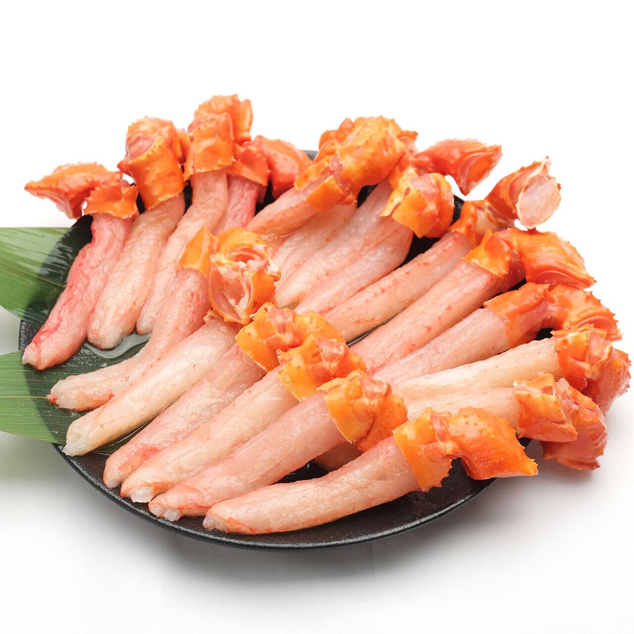 希少な「爪下」部位だけでたっぷり500g入り。希少部位だけを集めているので、この500gを作るのに、約6杯~8杯分の新鮮な紅ズワイガニを使用しています。1袋に500gには約26~30本入っており、一つ一つバラバラ凍結なので、食べる分だけ冷凍庫から取り出し食べることができます。