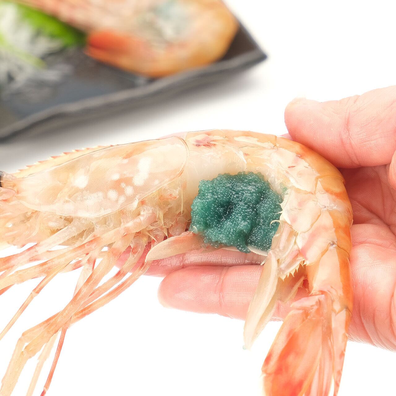 忘れてならないのがボタンエビの卵も絶品珍味です。初めて見ると、色が青緑や茶色でびっくりすると思いますが、この卵をわさび醤油や、めんつゆなどに漬けた醤油漬けにするとまた絶品なんです。ぜひ捨てずに卵も味わってください。