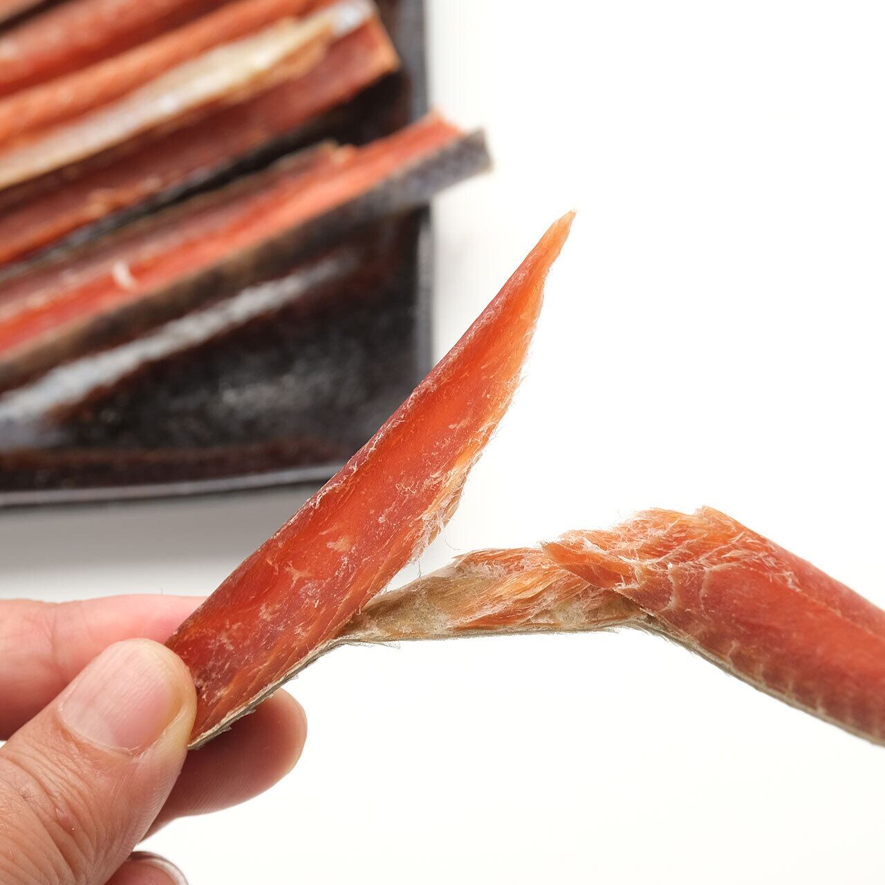昔ながらの鮭とばは、しっかりと干し上げて鮭の本来の旨味を最大限に熟成してつくるので硬くギュッと凝縮された逸品です。硬い鮭とばなので、手で折るとパキっと折れるような仕上がりですが、噛むたびに天然鮭の本来の旨味が口いっぱいに溢れ、じっくり、ゆっくりと噛みながら旨味の広がりを楽しみ味わうことができます。