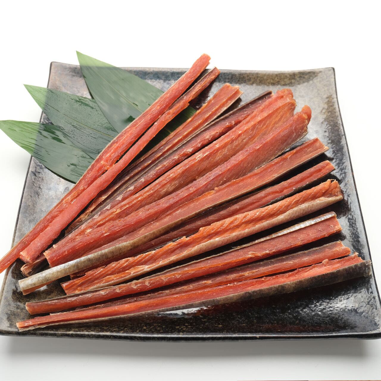 一般に販売されている鮭とばと言うと、砂糖や調味料などで味付けされたソフトタイプの柔らかいものが多いですが、今回ご紹介するのは北海道産の天然秋鮭と塩だけで作った「無添加鮭とば」。漢字で鮭とばは鮭冬葉と書く事から、秋に水揚げされた天然鮭を冬の寒い時期に熟成しながら寒干ししてつくる冬の北海道の昔から作られる風物詩でもあります。そんな昔ながらの製法を引き継いでつくる無添加鮭とばは、今では希少な逸品となっております。