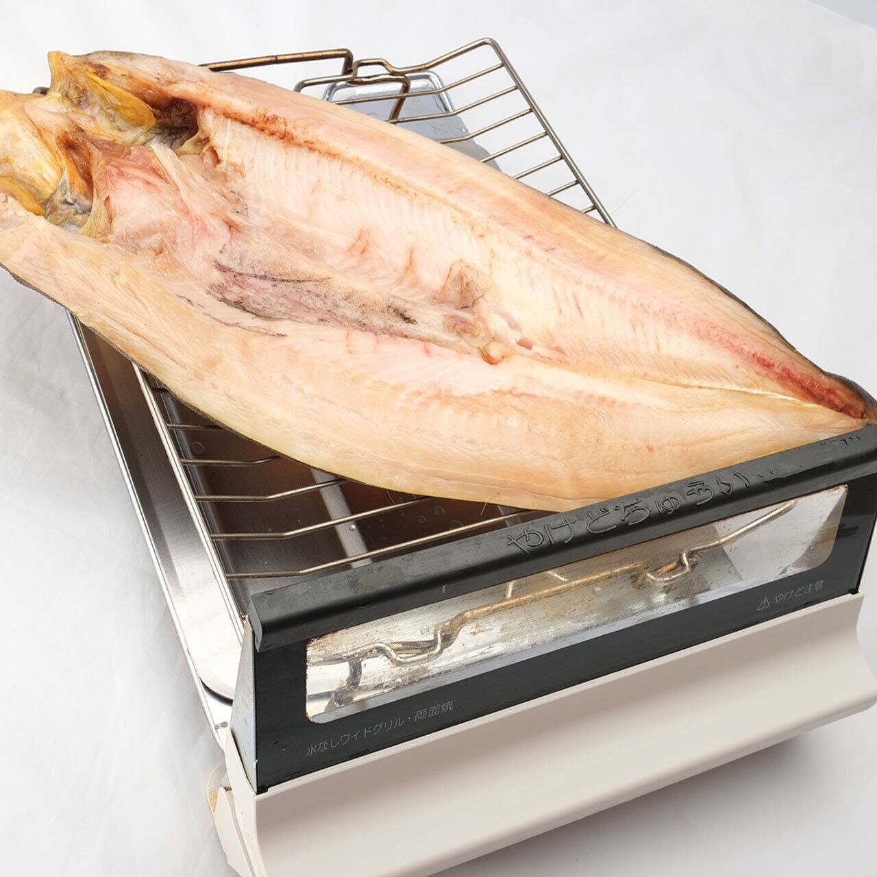 お届けするホッケは、超特大で重量は1㎏前後のホッケの開きです。そのため、一般的なグリルには入りきらないため、焼く際はホッケをカットしてから焼いてください。