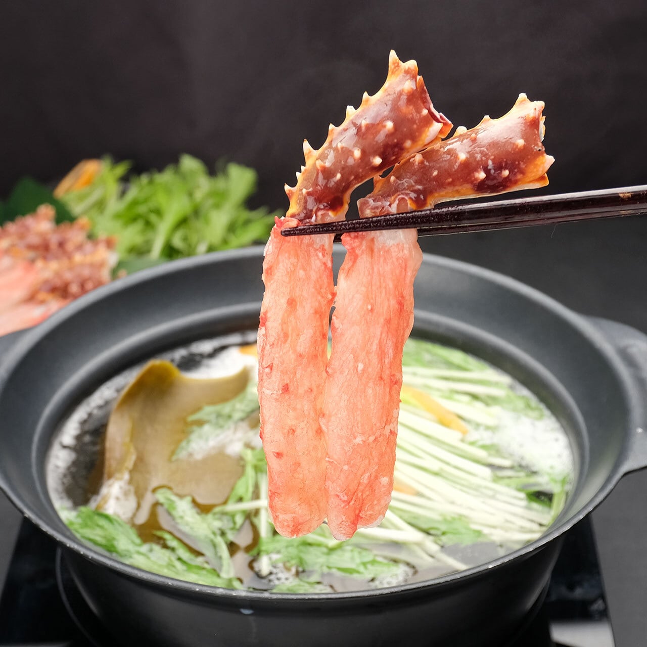 沸騰したお出汁にくぐらせると、外がプリッと締まった弾力ある食感になり、中はトロ~り甘くて旨味がじゅわ~っとあふれます。希少な生のタラバガニの美味しさをぜひこころゆくまで堪能してみてください。